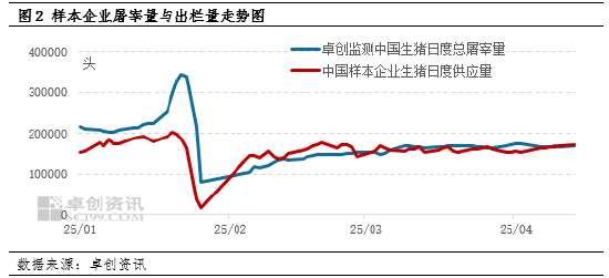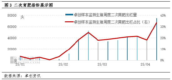 散户逐渐退市,同时近两年养殖端偏好短周期育肥模式,二次育肥常态化存在,且在年内形成随进随出状态。2025年2月份,二次育肥热度开始上升,随后热度相对平稳,4月中旬左右,部分养殖端认为猪价难跌,并对后市有看涨心态,二次育肥热度快速升高。卓创资讯监测,4月7日至4月13日,样本企业出栏生猪流入二次育肥渠道占比为33.54%,为年内最大占比。养殖端补栏二次育肥积极性较高,是支撑4月中旬猪价上涨的主要原因。