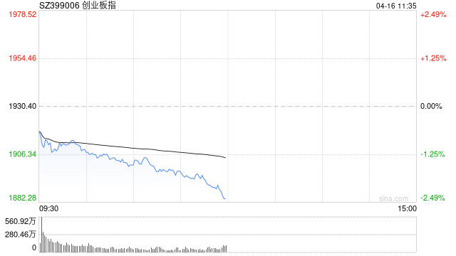 4月16日消息,指数早盘震荡走低,创指半日跌超2%。板块方面,旅游酒店板块逆势走强,金陵饭店盘中涨停;黄金概念股活跃,赤峰黄金涨幅居前;银行股震荡走强,上海银行领涨;农业股集体调整,种植方向领跌,神农种业跌幅居前;可控核聚变概念延续回调,合锻智能(维权)领跌;苹果概念股集体走低,东山精密、工业富联跌幅居前。总体来看,个股呈普跌态势,下跌个股超4800只。