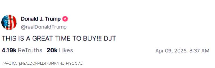 不过,特朗普上周曾亲自向投资者推荐买入DJT。在上周三宣布对数十个国家暂缓加征对等关税前,特朗普曾提前在社交媒体发文表示,“现在是买入的好时机!!!DJT”。