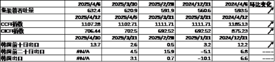 进出口数据方面,上周出口运价继续回升,同时韩国4月前十日出口数据有所回升。