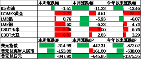 上周美元指数下行314.99BP,通胀低于预期叠加贸易战反复使得美元信用走弱,美元有所下行。在此背景下人民币上周升值153个基点,日元升值347.90个基点。