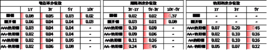 期限利差方面,上周利差大体走阔,30年国债利率降至1.86,大部分券种期限利差维持较低分位数区间。