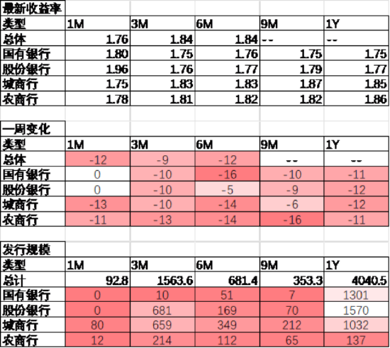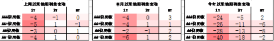 同业存单方面,上周发行利率有所下行,其中发行规模最多的1Y股份银行下行12BP,为1.77%;1Y国有银行下行11BP,为1.75%。