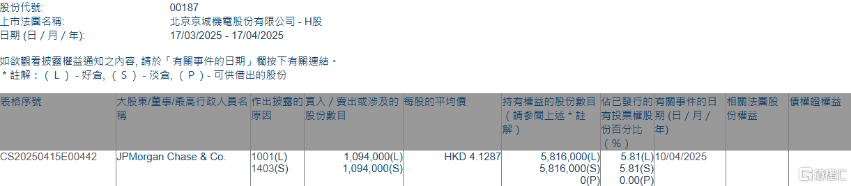 格隆汇4月17日丨根据联交所最新权益披露资料显示,2025年4月10日,京城机电股份(00187.HK)获JPMorgan Chase & Co.以每股均价4.1287港元增持好仓109.4万股,涉资约451.68万港元。