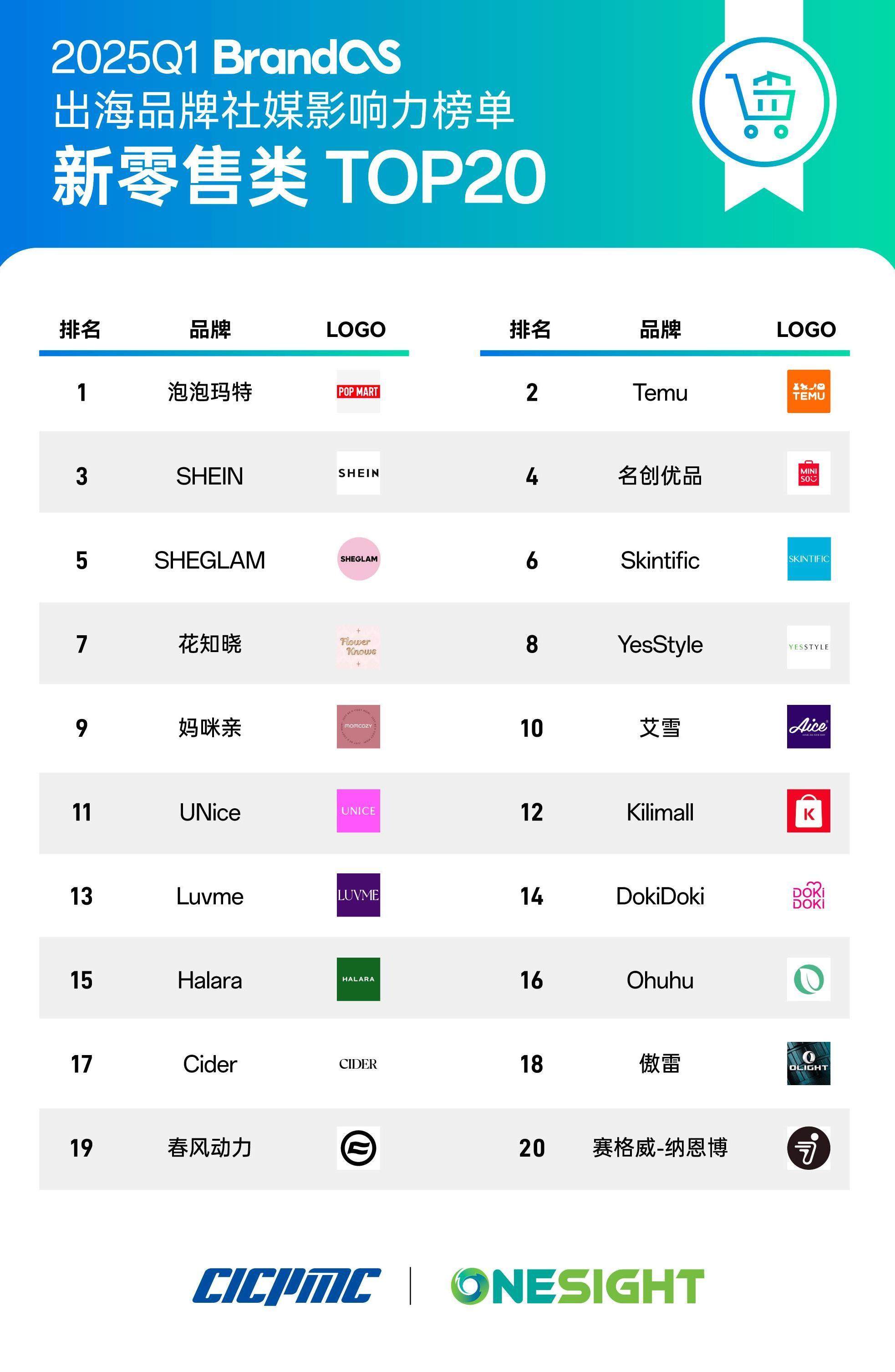 (图为2025Q1《BrandOS 出海品牌社媒影响力榜单》“新零售类 TOP20”;完整榜单可在OneSight查看)