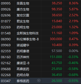 生物医药板块冲高回落,荣昌生物涨超8%。多家港股医药企业近期发布财报,成绩亮眼;部分港股上市药企在研产品取得阶段性突破。华鑫证券表示,完善创新药价格机制、构建多元化的支付体系,创新药的国内政策环境持续向好,同时海外临床数据陆续发布,对外授权进入高峰期,创新价值兑现加速。