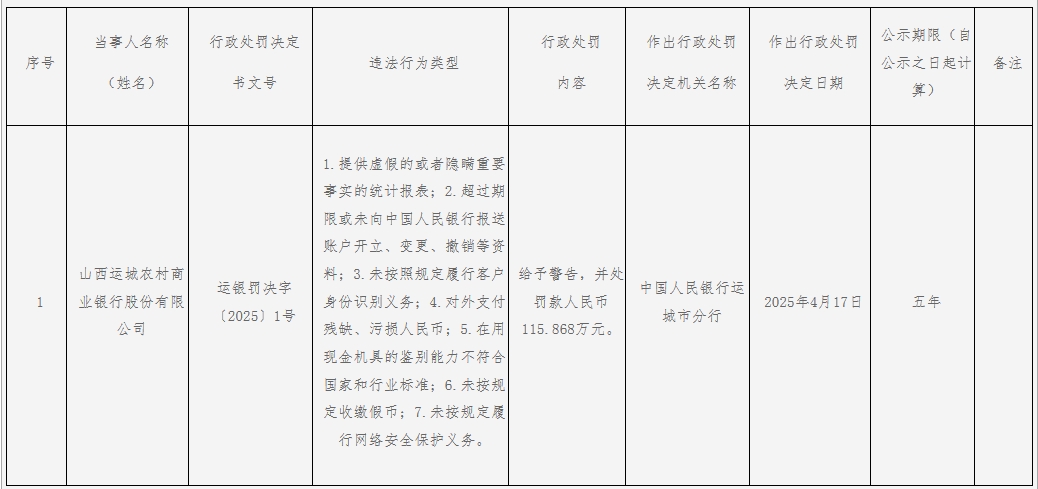 4月25日金融一线消息,中国人民银行运城市分行日前披露的行政处罚决定信息公示表显示,山西运城农村商业银行股份有限公司因提供虚假的或者隐瞒重要事实的统计报表;超过期限或未向中国人民银行报送账户开立、变更、撤销等资料;未按照规定履行客户身份识别义务;对外支付残缺、污损人民币;在用现金机具的鉴别能力不符合国家和行业标准;未按规定收缴假币;未按规定履行网络安全保护义务,受到警告并被罚款115.868万元。