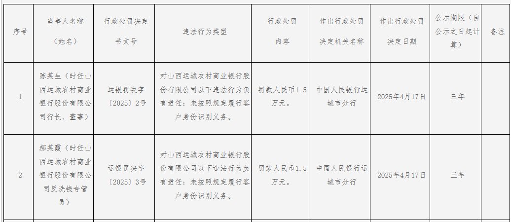 陈某生(时任山西运城农村商业银行股份有限公司行长、董事)、郝某霞(时任山西运城农村商业银行股份有限公司反洗钱专管员)二人对该行未按照规定履行客户身份识别义务负有责任,分别被罚款1.5万元。