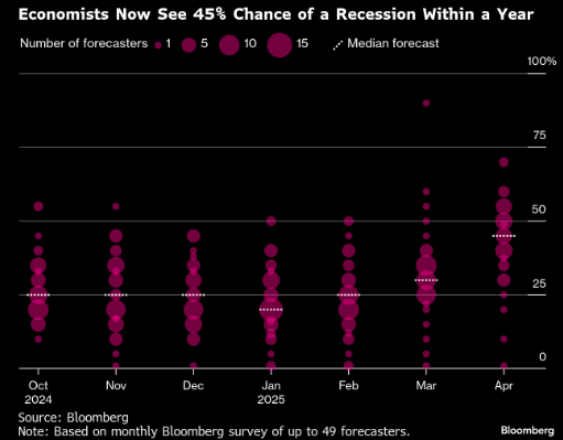 这种担忧已经不限于美联储观察人士。密歇根大学周五早些时候发布的一份报告显示,4月美国消费者通胀预期大幅上升。本月对经济学家的调查显示,贸易冲突导致美国经济衰退的概率已经达到50%。