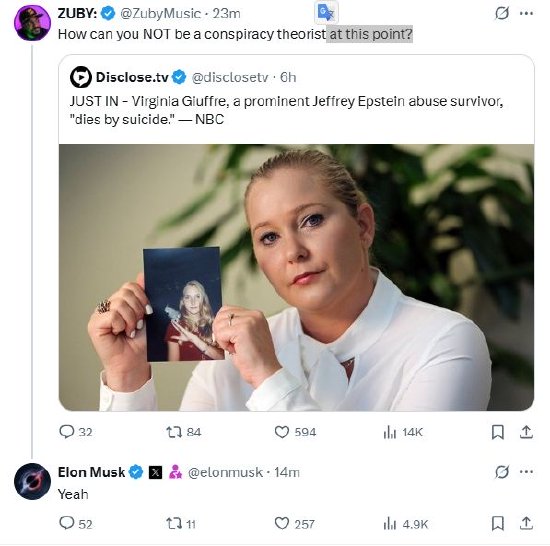 爱泼斯坦案最著名的受害者之一弗吉尼亚·朱弗雷(Virginia Giuffre)的家人4月25日表示,她已自杀身亡。朱弗雷是最早呼吁对爱泼斯坦及其帮凶提起刑事指控的人之一。她向执法部门提供了关键信息,促成了对爱泼斯坦的同伙吉丝兰·麦克斯韦尔的调查和定罪。朱弗雷还表示,爱泼斯坦曾把她卖给他的权势朋友,包括英国安德鲁王子和法国模特经纪人让-吕克·布鲁内尔。