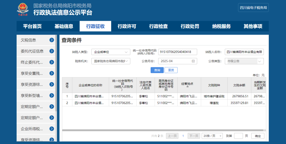近日,国家税务总局绵阳市税务局行政执法信息公示平台披露,四川省绵阳市丰谷酒业有限责任公司(下称“丰谷酒业”)因欠缴增值税3559万元被列入欠税名单,这一消息与其“川酒十朵小金花之首”的行业地位形成强烈反差,迅速引发市场对其经营状况的关注。