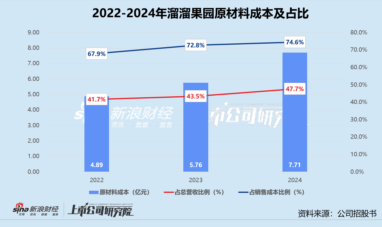 2020-2024年,国内青梅价格从每吨2400元涨至2600元,年复合增长率约2%。进口西梅由于天气恶劣,叠加运输成本上升、物流中断、通胀水平走高等诸多不利因素,每吨价格从1.62万元涨至2.07万元,年复合增长率约6.3%。这导致溜溜果园的原材料成本由2022年的4.89亿元攀升至2024年的7.71亿元,分别占各期总收入41.7%、43.6%、47.7%,呈递增态势。