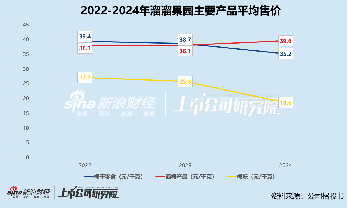 竞争白热化卷入“价格战”、量贩零食折扣店渠道集中,溜溜果园的梅干零食和梅冻平均价格被迫三连降。2022-2024年,其梅干零食售价从39.4元/千克降至35.2元/千克,梅冻售价从27.2元/千克降至18.6元/千克,西梅产品虽然顺利提价3.1%,但难以抵消西梅原材料成本增幅。
