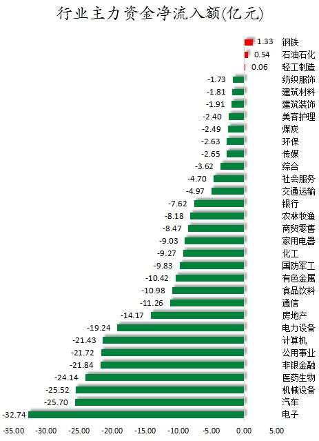 从行业来看,申万所属的31个一级行业,今日仅有钢铁、石油石化、轻工制造3个行业主力资金呈现净流入,净流入金额分别为1.33亿元、0.54亿元、0.06亿元。28个行业主力资金呈现净流出,其中,电子行业主力资金净流出最多,净流出金额为32.74亿元;行业主力资金净流出靠前的还有汽车、机械设备、医药生物、非银金融、公用事业、计算机等,净流出金额分别为25.7亿元、25.52亿元、24.14亿元、21.84亿元、21.72亿元、21.43亿元。
