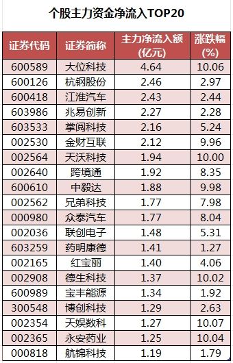 个股来看,今日有1773只个股获主力资金净流入,其中,26股获主力资金净流入超1亿元。大位科技主力资金净流入最多,净流入金额为4.64亿元;主力资金净流入居前的个股还有杭钢股份(600126)、江淮汽车(600418)、兆易创新、掌阅科技(603533)、金财互联等,净流入金额分别为2.46亿元、2.43亿元、2.27亿元、2.16亿元、2.12亿元。