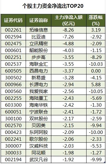 今日有3348只个股被主力资金净卖出,其中,77股被主力资金净卖出超1亿元。主力资金净流出最多的个股是拓维信息(002261),净流出金额为8.26亿元;主力资金净流出居前的个股还有比亚迪(002594)、立讯精密(002475)、韶能股份(000601)、步步高(002251)、海联金汇(002537)等,净流出金额分别为7.26亿元、4.88亿元、4.03亿元、3.55亿元、3.55亿元。