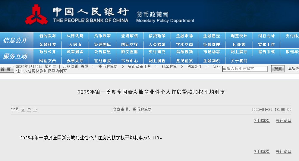 4月29日金融一线消息,央行数据显示,2025年第一季度全国新发放商业性个人住房贷款加权平均利率为3.11%。