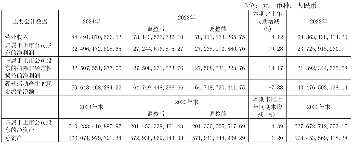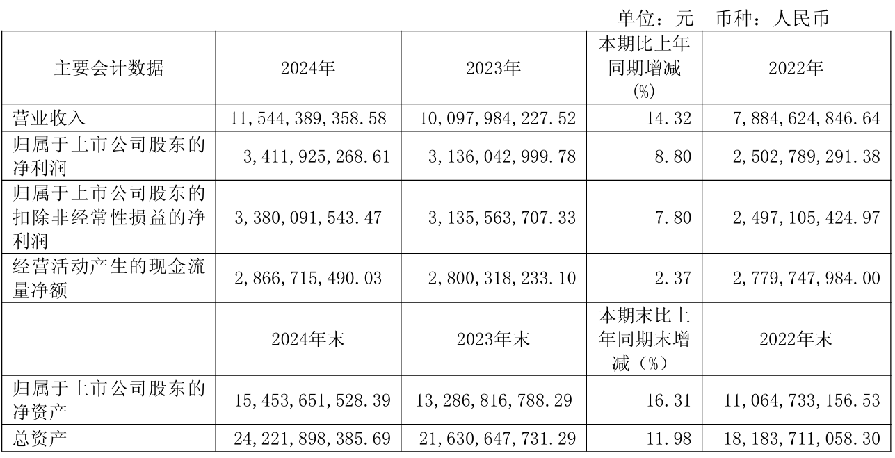 今世缘(603369.SH)发布2024年报和2025年一季度报。根据披露,报告期内,公司实现营业收入115.44亿元、同比增长14.32%;实现归属于上市公司股东的净利润34.12亿元,同比增长8.80%;实现扣除非经常性损益后的归属于上市公司股东的净利润33.80 亿元,同比增长7.80%。