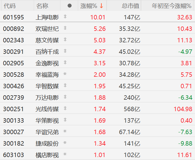 格隆汇4月30日|A股市场影视股走高,其中,上海电影涨停,慈文传媒(002343)、欢瑞世纪(000892)涨超5%,百纳千成涨超4%,金逸影视(002905)、奥飞娱乐(002292)、华谊兄弟(300027)、万达电影(002739)、华策影视(300133)等跟涨。消息面上,据网络平台数据,截至4月30日11时58分,2025年五一档首日电影预售票房破3000万。