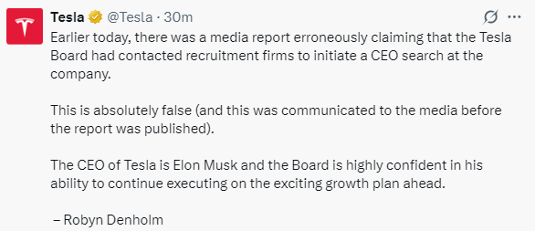 “今天早些时候,有媒体错误地报道称特斯拉董事会已联系招聘公司,启动寻找新任CEO的程序,”Denholm在特斯拉的X账号上发文称,“这是完全错误的。”