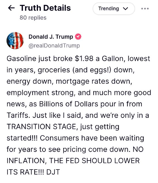 特朗普:汽油价格刚刚跌破每加仑1.98美元,为多年来最低,食品杂货(和鸡蛋!)价格下降,能源价格下降,抵押贷款利率下降,就业强劲,还有更多好消息,因为数十亿美元从关税中涌入。正如我所说,我们只是处于过渡阶段,刚刚开始!!!消费者已经等待多年,希望看到价格下降。(我们)没有通货膨胀,美联储应该降低利率!!DJT