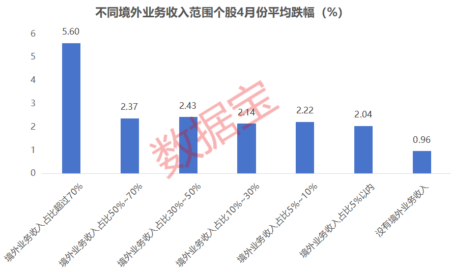 举例来看,移为通信(300590)2022年至2024年境外业务收入占比持续超过85%,今年4月份跌幅超过15%。赢合科技(300457)2022年至2024年境外业务收入占比位于40%至50%之间,今年4月份跌幅也超过15%。有友食品(603697)4月份以来股价涨幅超过25%,公司业务集中在国内。