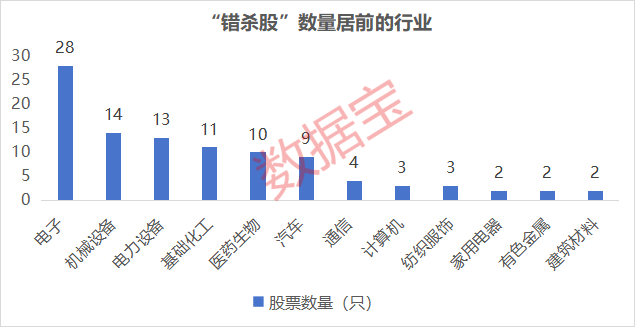 从行业分布来看,上述108只个股(下称“错杀股”)主要分布在电子、机械设备、电力设备三大行业,分别包含28股、14股、13股;另外,基础化工、医药生物行业也均有10只及以上个股。