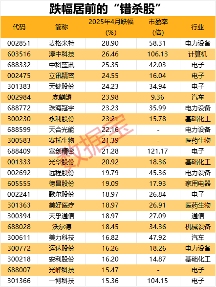 从单只个股来看,上述“错杀股”中,4月份跌幅超过15%的个股有23只;其中,麦格米特(002851)、淳中科技(603516)、中科蓝讯4月份跌幅均超过25%。