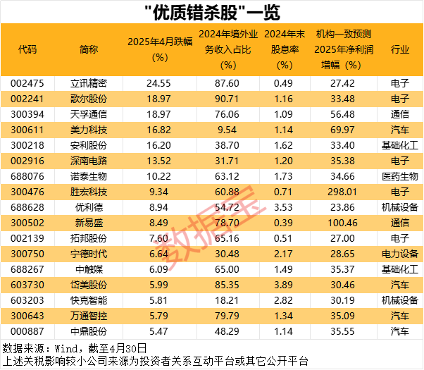 据数据宝统计,截至4月30日,上述“错杀股”中,2024年存在出海业务;2024年及2025年一季度净利润及增幅均为正值,且机构一致预测2025年净利润增幅超过20%;2022年至2024年持续分红;4月份股价跌幅超过5%的个股有17只(下称“优质错杀股”)。