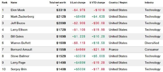 特斯拉CEO埃隆·马斯克仍然稳居首富,净资产为3310亿美元,今年缩水了1010亿美元。
