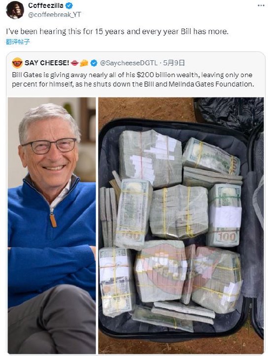然而,网上的反应褒贬不一。YouTube网红Stephen Findeisen(网名Coffeezilla),是表达怀疑的人之一,他在X上发帖说:“我听这个已经听了15年了,比尔每年都有更多钱。”