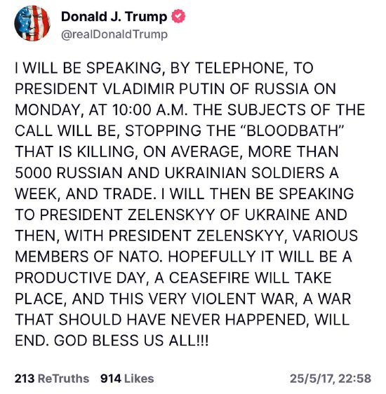美国总统特朗普在其社交媒体发言称将于周一上午10点与俄罗斯总统普京通话,主要议题是讨论停止俄乌冲突以及贸易问题。