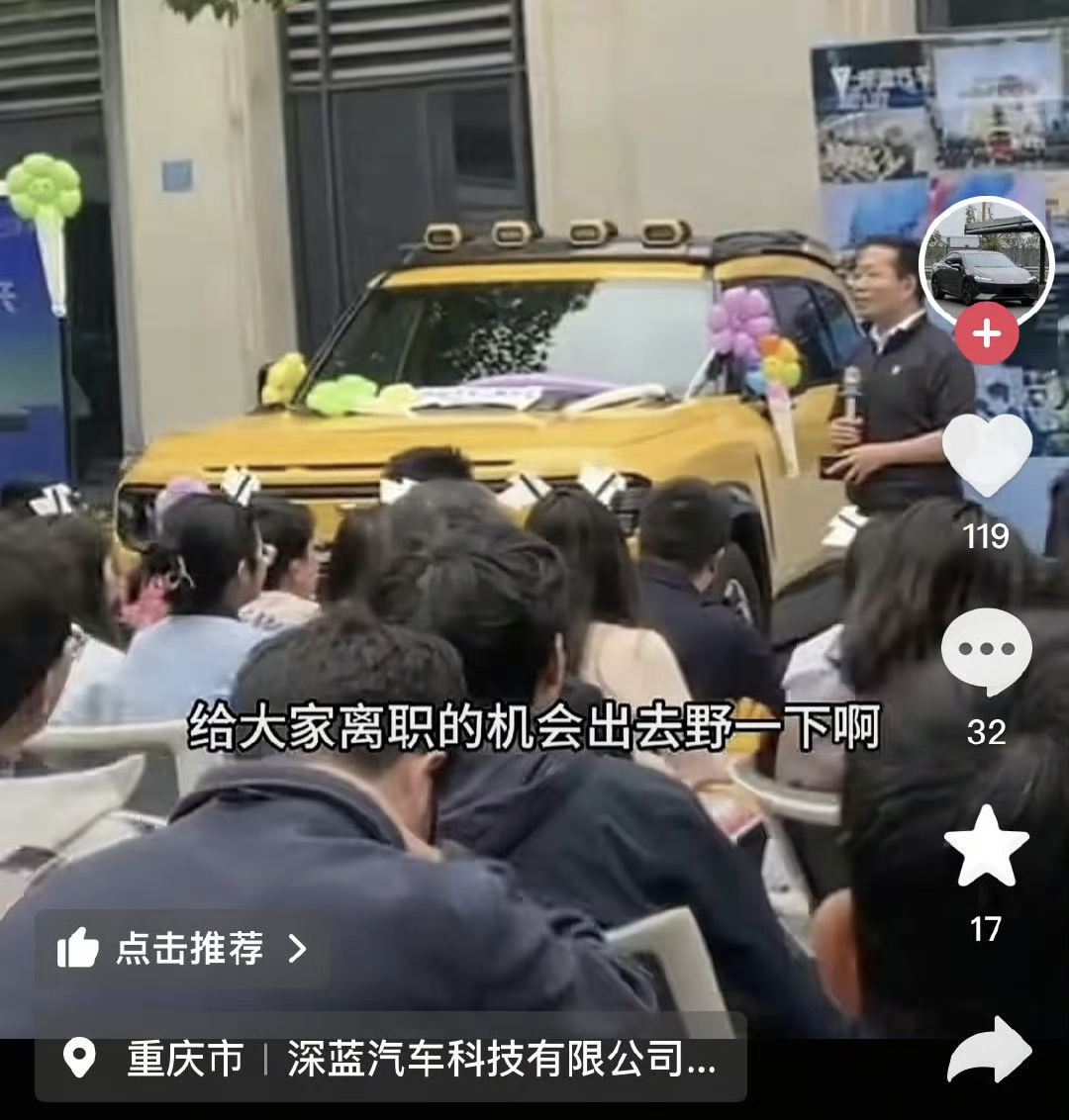 日前,在深蓝汽车三周年的活动上,公司CEO邓承浩表示,支持购买了G318无忧穿越版的员工离职出去“野”,之后公司再把员工召回来。该言论被拍成视频在网络上曝光后引发轩然大波,并迅速登上热搜。