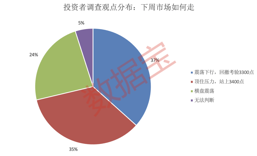 对于节后一周的大盘走势,多空激辩。认为大盘将“震荡下行,回撤考验3300点”占比的投资者为37%;认为“顶住压力,站上3400点”的观点比例为35%;认为“横盘震荡”的观点比例为24%。