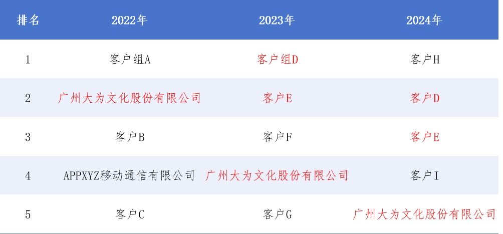 另一方面,随手播的客户忠诚度较差,前五大客户席位变动频繁。报告期内连续三年成为随手播前五大客户的公司仅关联方广州大为一家,该客户贡献收入从0.57亿元减少至0.4亿元,降幅达29.82%。客户组A为随手播2022年第一大客户,贡献了七成收入,但2023年及2024年从前五大客户名单中销声匿迹,仅保留了客户E(客户组A中的公司之一),且销售占比分别下滑至27.5%、11.3%。