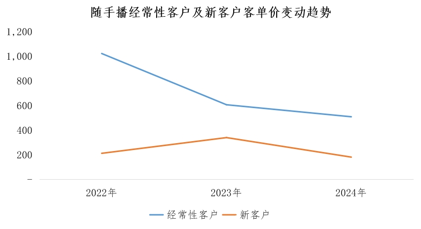 显然,经常性客户的客单价显著高于新客户的客单价,约是后者的2~5倍。但无论是经常性客户还是新客户,其客单价均呈持续下降趋势,反映出随手播“以价换量”的市场战略。