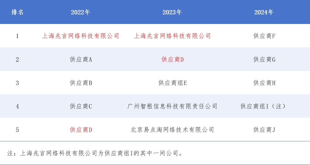 报告期内,随手播前五大客户名单中不重名公司多达13家,主要供应商变动频繁。尤以2024年为甚,随手播前五大供应商名单迎来“大洗牌”,原第一大供应商上海兆言网络科技有限公司并入供应商组I后,降为第4大供应商,采购比例仅剩4%。