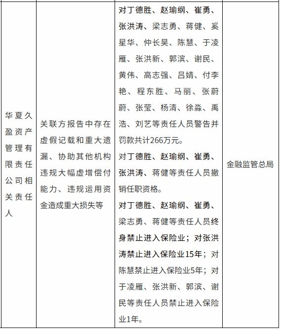 其中,金融监管总局对丁德胜、赵瑜纲、崔勇、张洪涛、梁志勇、蒋健、奚星华、仲长昊、陈慧、于凌雁、张洪新、郭滨、谢民、黄伟、高志强、吕婧、付李艳、程东胜、马丽、张蔚蔚、张莹、杨清、徐淼、禹浩、刘艺等责任人员警告并罚款共计266万元。