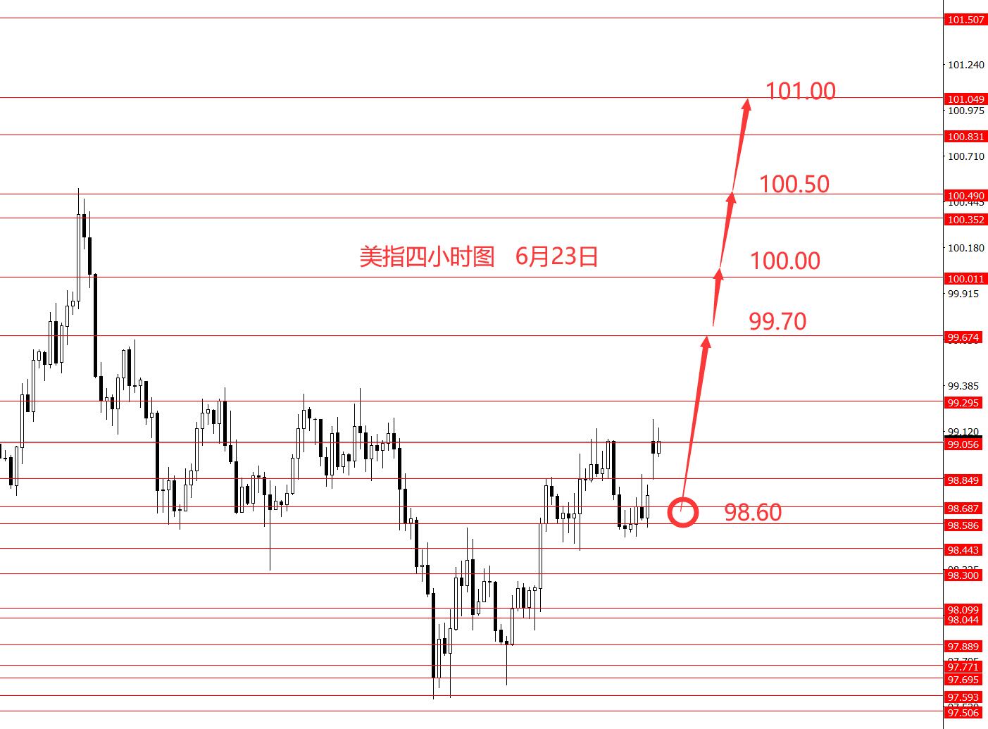 美指上周正如预期二次探底后向上反弹,并成功站稳98.80上方。从图形来看,底部形态已见雏形,本周继续逢低做多美指,延用上周一框架即可。本周一跳空高开,下方重点关注98.40,以上偏向于看涨,继续逢低做多,周一早盘先重点关注99.30强阻力吧,若一次成功上破,则继续向上运行,若99.30承压,周一在99.30-98.60区间震荡的概率较大些,震荡完,继续逢低做多美指。本周操作建议:98.60-98.70区域做多,止损97.90,目标看向99.70和100,再看向100.50和101.00区域。控制仓量,严格止损。