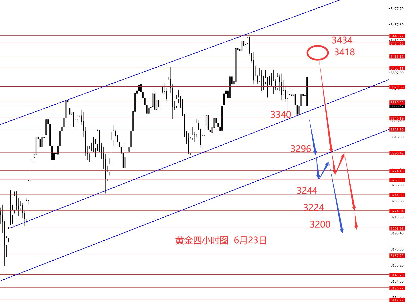 黄金上周正如预期,3440附近反转走了红线分析,3340也到位。从图形来看,今日早盘虽然跳空高开,但高开低走,本周初,继续关注3340区域强支撑,在没成功跌破前,继续在上方震荡盘整的概率较大些,而上方3418和3434仍是强阻力,还是建议选择高空为主方向,若周一直接跌破3340则再择机进场做空,波段思路仍延用上周一框架,波段目标仍 是3296和3274和3244和3224,最远3200一线重点值得关注。本周操作建议灵活些,今日没有具体操作建议。