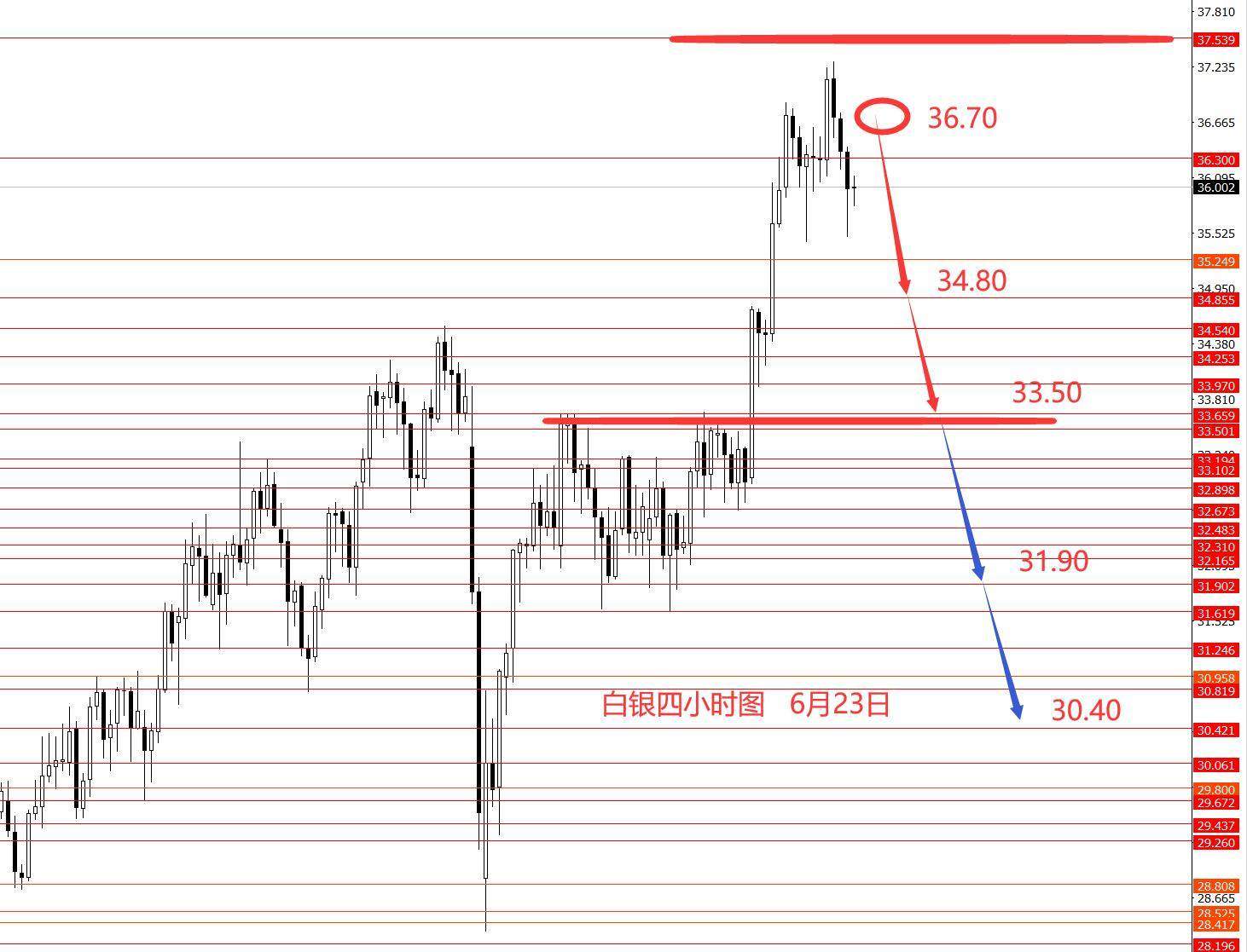 白银上周正如预期冲高回落,周图收阴柱。从图形来看,本周建议逢高做空白银,先按回调行情先做,下方重点关注33.50一线强支撑,若能下破才能看向更低。本周操作建议:36.70-36.80区域做空白银,止损37.80,目标看向34.80和34.00和33.50区域。若33.50成功跌破再看向31.90和30.40区域。控制仓量,严格止损。