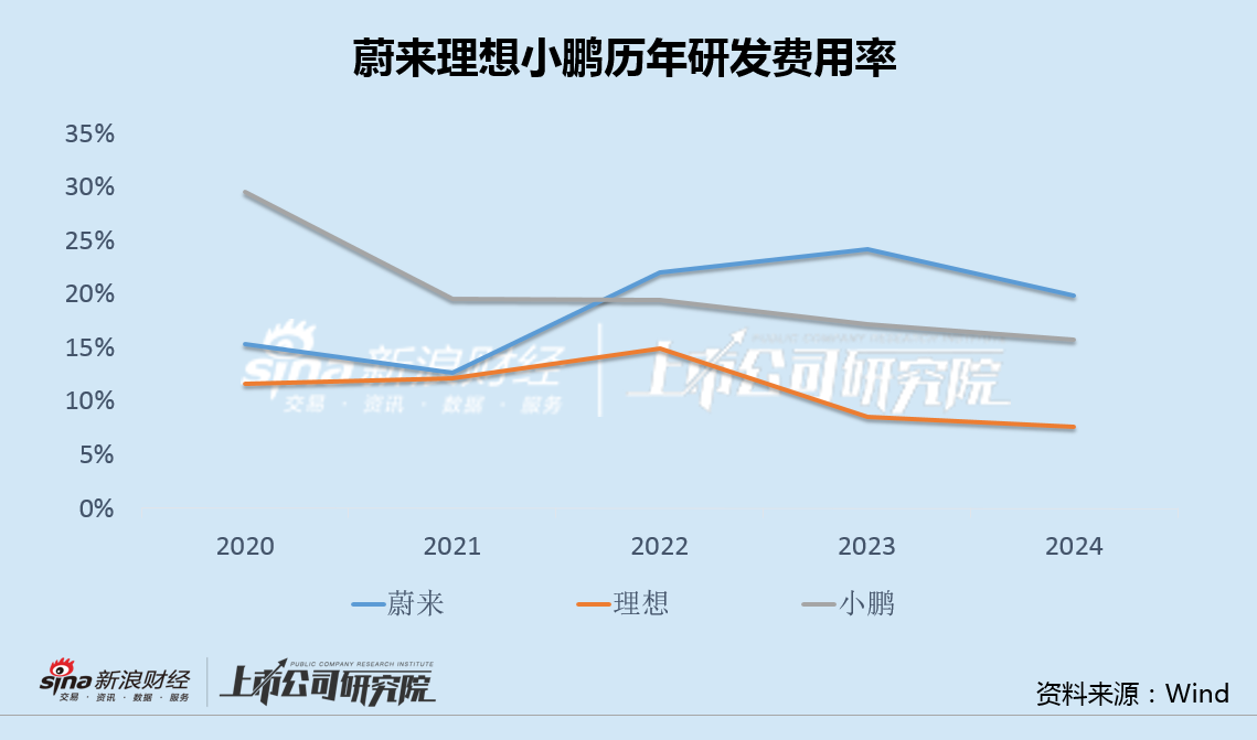 此前,理想依靠混动路线、“套娃式”车型设计和规模效应等,率先实现盈利。然而,随着销量增速的下滑,叠加低研发费用率难以为继,业绩或将进一步承压。