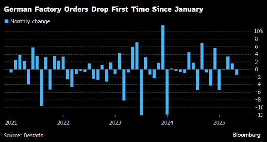 德国工厂订单四个月来首次下跌,原因是在与美国贸易的不确定性尘埃落定之前,德国本土企业对承诺大规模投资持谨慎态度。