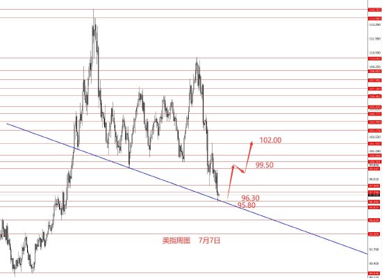 7月7日,美指6.23分析错误,美指99.30承压继续向下运行,最低96.30.从图形来看,美指已到达周线级别强支撑,这波从110趺下来的长线波段行情已到达极限,后市倾向于逢低做多美指,中线向上反弹修整的概率较大,虽然上次博底失败,但中长线分析,后市美指向上测试102的概率相对较大。目前美指日线级别底部还没出来,四小时级别给的反弹信号,是否能小级别带动大级别,还有待确认。今日建议观望,等待日线级别转势信号出现后再进场做多。