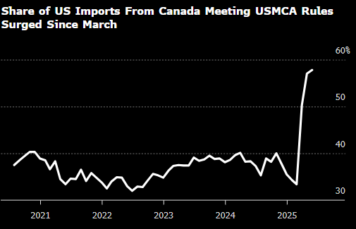 一位不愿具名讨论此事的官员表示,特朗普提到的对加拿大35%的关税不适用于符合美墨加协定规则的商品,这一豁免预计仍将保留。