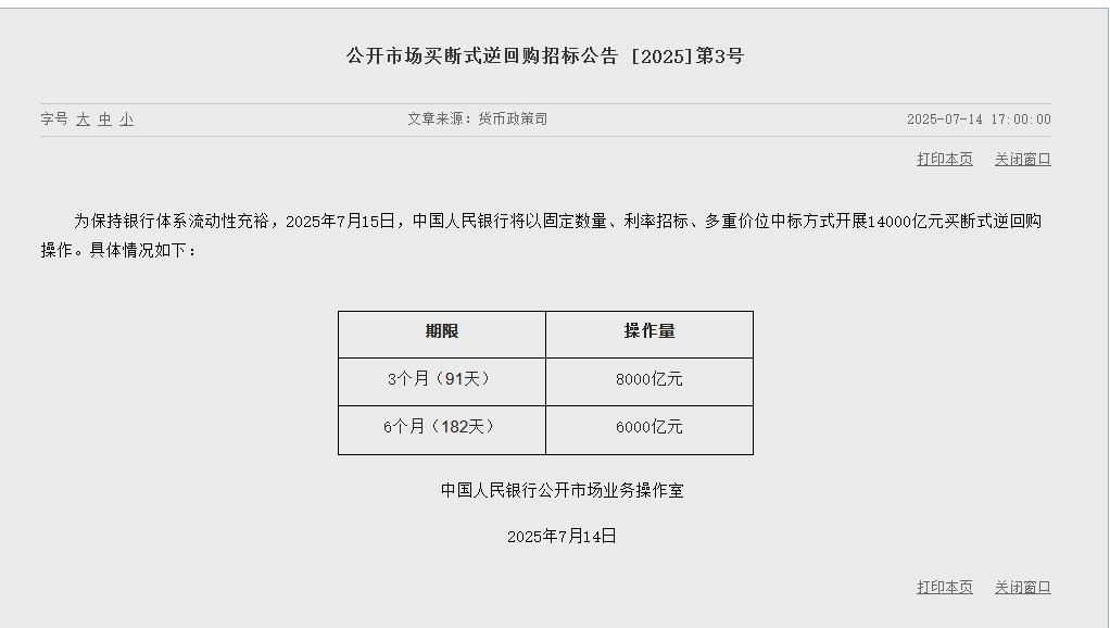 7月14日金融一线消息,为保持银行体系流动性充裕,2025年7月15日,中国人民银行将以固定数量、利率招标、多重价位中标方式开展14000亿元买断式逆回购操作。