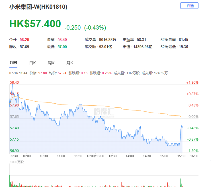 格隆汇7月16日|小米集团(1810.HK)短线上升,现跌0.35%。消息上,此前英伟达CEO黄仁勋表示非常希望购买一辆小米汽车。