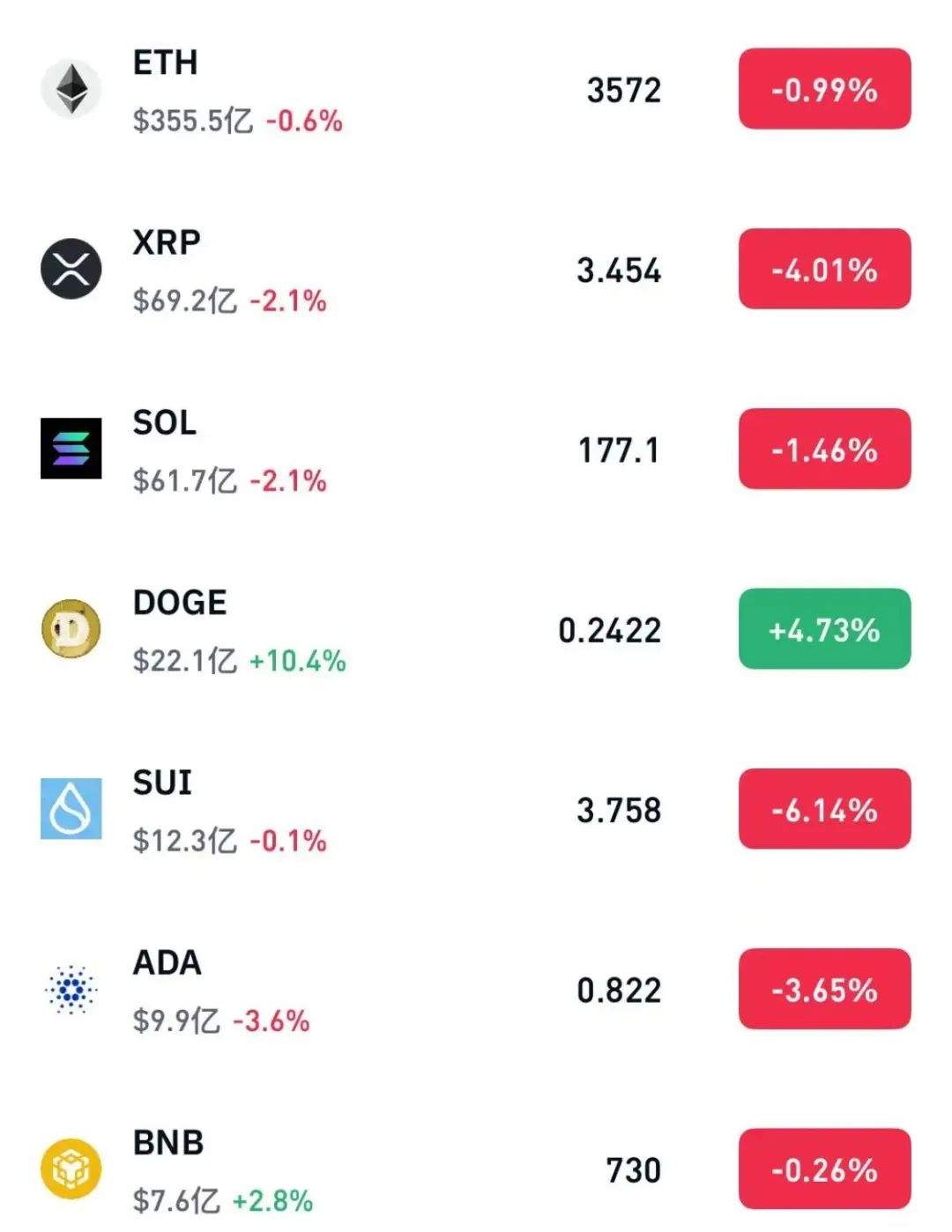 除了比特币外,多数加密货币均出现回调。其中,以太坊跌约1%,SUI跌超6%,XRP跌超4%,ADA跌超3%。