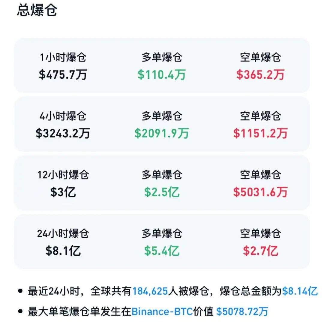 CoinGlass数据显示,过去24小时内,加密货币市场超18万人爆仓,爆仓总金额超8亿美元。