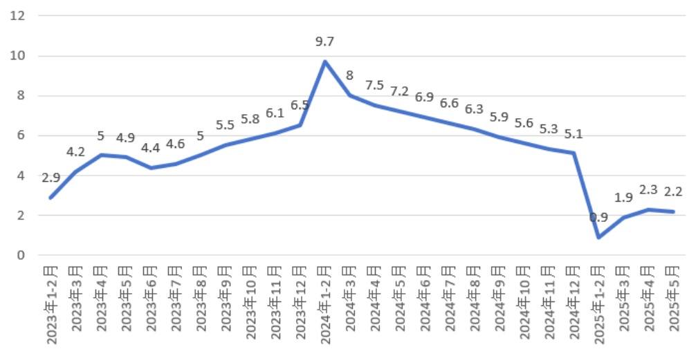 2025年1―5月,第二产业用电量25914亿千瓦时,同比增长2.2%(见图1)。
